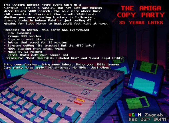 Nakon 35 godina održan je ponovno THE AMIGA COPY PARTY u Zagrebu na lokaciji Video Game History Museum. Skupio se originalni tim sa tada održanog Amiga copy party u GSC Kulušić. Hrpa Amiga, glazbenih instrumenata i naravno X-Copy je opet bio u akciji kao nekad! ![]() ![]() ![]() ![]() | |||||||||||||||||||||||||||||||||||||||||||
