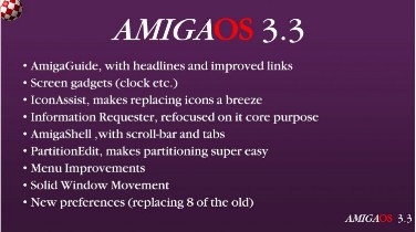 Hyperion je najavio da u 2026-oj izdaje novu verziju klasičnog 68k AmigaOS V3.3. Razvoj nove verzije je pred završetkom. Neki detalji nove verzije uključuju modernizaciju operativnog sustava bez da se izgubi pojavnost i funkcija originala, napravljen je novi alat za diskove (PartitionEdit), novi set ikona pod imenom Moonlight. Sve novosti su u niže prikazanoj prezentaciji. ![]() ![]() ![]() | |||||||||||||||||||||||||||||||||||||||||||